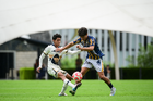 Ciudad de México, 22 de octubre de 2025. José Chávez y Christopher Monjarás, durante el partido correspondiente a la jornada 14 del torneo Apertura 2025 de la Liga BBVA MX categoría Sub19, entre los Pumas de la UNAM y el Atlético de San Luis, realizado en Cantera. Foto: Imago7/ Alexis Chavez