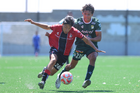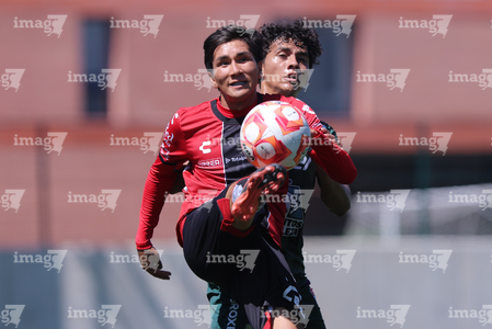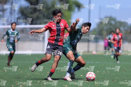 Zapopan, Jalisco, 22 de octubre de 2025. Brandon Rangel y Roberto López, durante el partido correspondiente a la jornada 14 del torneo Apertura 2025 de la Liga BBVA MX categoría Sub19, entre los Rojinegros del Atlas y los Esmeraldas del León, realizado en la Academia AGA. Foto: Imago7/ Juan Carlos Cubeyro.
