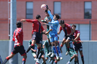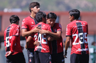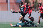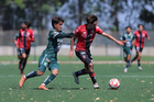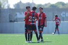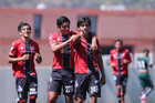 Zapopan, Jalisco, 22 de octubre de 2025. Jorge Quiñones recibe gol, durante el partido correspondiente a la jornada 14 del torneo Apertura 2025 de la Liga BBVA MX categoría Sub19, entre los Rojinegros del Atlas y los Esmeraldas del León, realizado en la Academia AGA. Foto: Imago7/ Juan Carlos Cubeyro.