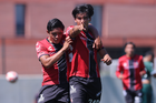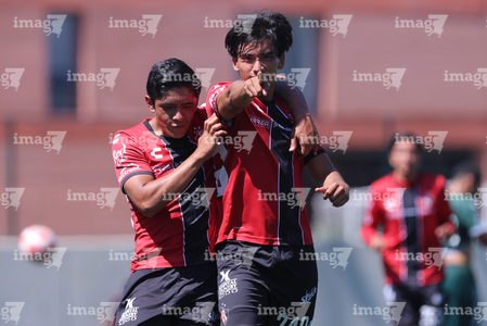 Zapopan, Jalisco, 22 de octubre de 2025. Alan Romero y Milton Esponda, durante el partido correspondiente a la jornada 14 del torneo Apertura 2025 de la Liga BBVA MX categoría Sub19, entre los Rojinegros del Atlas y los Esmeraldas del León, realizado en la Academia AGA. Foto: Imago7/ Juan Carlos Cubeyro.