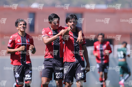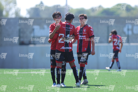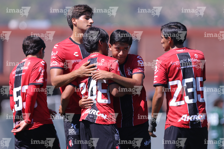 Zapopan, Jalisco, 22 de octubre de 2025. Jugadores de Atlas en festejo de gol, durante el partido correspondiente a la jornada 14 del torneo Apertura 2025 de la Liga BBVA MX categoría Sub19, entre los Rojinegros del Atlas y los Esmeraldas del León, realizado en la Academia AGA. Foto: Imago7/ Juan Carlos Cubeyro.