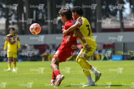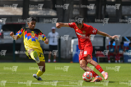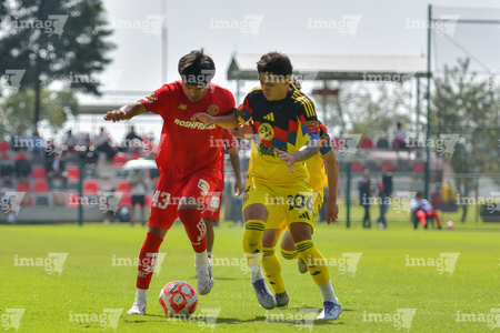 Metepec, Estado de México, 8 de noviembre de 2025. Cedric Sánchez y Derek Jiménez , durante el partido correspondiente a la jornada 17 del torneo Apertura 2025 de la Liga BBVA MX categoría Sub19, entre los Diablos Rojos del Toluca y las Águilas del América, realizado en las instalaciones de Metepec. Foto: Imago7/ Arturo Hernandez