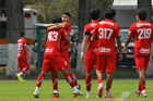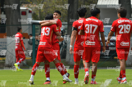 Metepec, Estado de México, 8 de noviembre de 2025. Jugadores del Toluca sub19 en festejo de gol, durante el partido correspondiente a la jornada 17 del torneo Apertura 2025 de la Liga BBVA MX categoría Sub19, entre los Diablos Rojos del Toluca y las Águilas del América, realizado en las instalaciones de Metepec. Foto: Imago7/ Arturo Hernandez