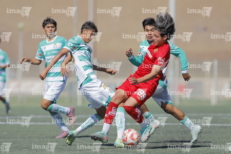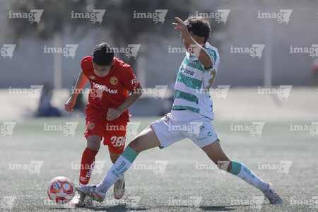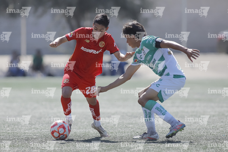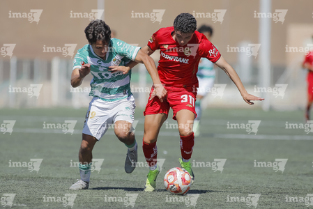 Torreón, Coahuila, 12 de noviembre de 2025. Leonardo Guerrero y José Pinto, durante el partido correspondiente a la ida de los Cuartos de Final del torneo Apertura 2025 de la Liga BBVA MX categoría Sub17, entre los Guerreros de Santos Laguna y los Diablos Rojos del Toluca, realizado en el TSM. Foto: Imago7/ Saul Perales