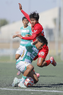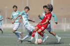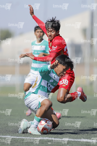 Torreón, Coahuila, 12 de noviembre de 2025. Saul Duarte y José Pinto, durante el partido correspondiente a la ida de los Cuartos de Final del torneo Apertura 2025 de la Liga BBVA MX categoría Sub17, entre los Guerreros de Santos Laguna y los Diablos Rojos del Toluca, realizado en el TSM. Foto: Imago7/ Saul Perales