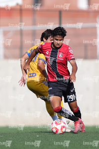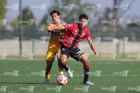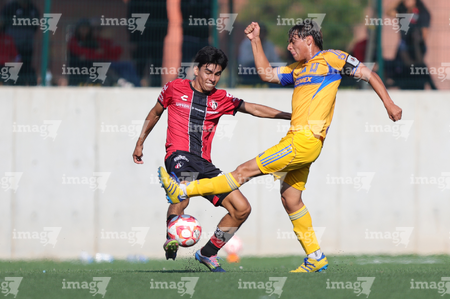 Guadalajara, Jalisco, 19 de noviembre de 2025. Orlando Gutierrez (I), durante el partido correspondiente a la ida de las Semifinales del torneo Apertura 2025 de la Liga BBVA categoría Sub17, entre los Rojinegros del Atlas y los Tigres de la UANL, realizado en la Academia AGA. Foto: Imago7/ Cristian Hernández