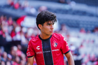Guadalajara, Jalisco, 26 de noviembre de 2025. Olmo Godinez (I), durante el partido correspondiente a la ida de la Gran Final del torneo Apertura 2025 de la Liga BBVA categoría Sub17, entre los Rojinegros del Atlas y los Rayados de Monterrey, realizado en el estadio Jalisco. Foto: Imago7/ Juan Carlos Cubeyro.