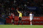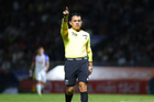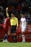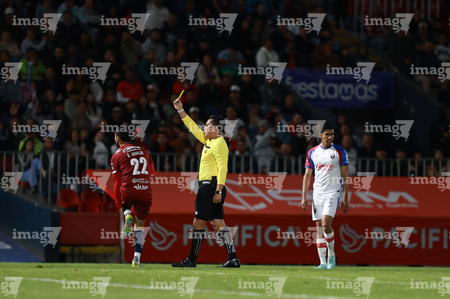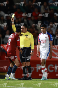 Tepatitlán, Jalisco, 12 de noviembre del 2025. Jaime Orlando Montes Santos, árbitro central, muestra tarjeta amarilla de amonestación, durante el partido correspondiente a la ida de los Cuartos de Final del torneo Apertura 2025 de la Liga BBVA Expansión MX, entre los Alteños de Tepatitlán FC y los Potros de Hierro del Atlante FC, realizado en el estadio “Tepa” Gómez. Foto: Imago7/Cristian Hernandez