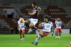 Zacatecas, Zacatecas, 12 de noviembre de 2025. Leonardo Durán en festejo, durante el partido correspondiente a la ida de los Cuartos de Final del torneo Apertura 2025 de la Liga BBVA Expansión MX, entre los Mineros de Zacatecas y los Freseros de Irapuato, realizado en el estadio Carlos Vega Villalba. Foto: Imago7/ Raúl Martínez