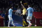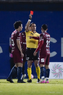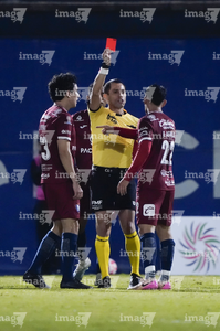 Tepatitlán, Jalisco, 20 de noviembre del 2025. Orlando Delgadillo Franco, árbitro central, muestra tarjeta roja de expulsión a Diego Aguilar, durante el partido correspondiente a la ida de las Semifinales del torneo Apertura 2025 de la Liga BBVA Expansión MX, entre los Alteños de Tepatitlán FC y la Jaiba Brava del Tampico Madero, realizado en el estadio “Tepa” Gómez. Foto: Imago7/Sebastian Laureano Miranda