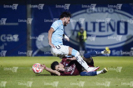 Tepatitlán, Jalisco, 20 de noviembre del 2025. Diego Aguilar y Jesús Escoboza, durante el partido correspondiente a la ida de las Semifinales del torneo Apertura 2025 de la Liga BBVA Expansión MX, entre los Alteños de Tepatitlán FC y la Jaiba Brava del Tampico Madero, realizado en el estadio “Tepa” Gómez. Foto: Imago7/Sebastian Laureano Miranda