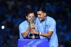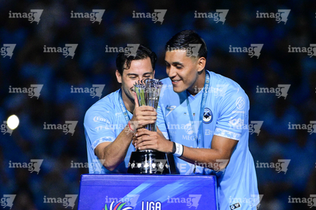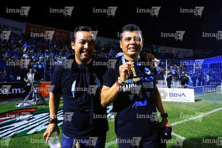Tampico Madero, Tamaulipas, 6 de diciembre de 2025. Eduardo Pérez y José López en festejo con Trofeo de campeón, durante el partido correspondiente a la vuelta de la Gran Final del torneo Apertura 2025 de la Liga BBVA Expansión MX, entre la Jaiba Brava del Tampico Madero y los Freseros de irapuato, realizado en el estadio Tamaulipas. Foto: Imago7/ Alexis Chavez