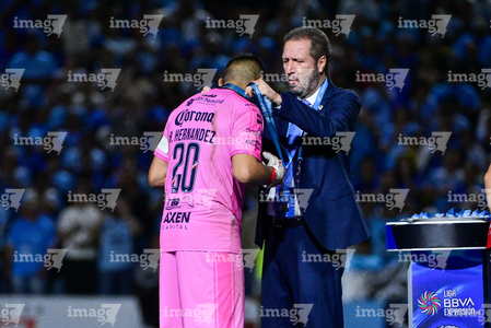 Tampico Madero, Tamaulipas, 6 de diciembre de 2025. Humberto ¨Gansito¨ Hernández recibe medalla de subcampeón, durante el partido correspondiente a la vuelta de la Gran Final del torneo Apertura 2025 de la Liga BBVA Expansión MX, entre la Jaiba Brava del Tampico Madero y los Freseros de irapuato, realizado en el estadio Tamaulipas. Foto: Imago7/ Alexis Chavez