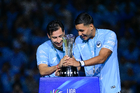 Tampico Madero, Tamaulipas, 6 de diciembre de 2025. Sergio Flores y Gerardo Ruíz en festejo con el trofeo de campeón, durante el partido correspondiente a la vuelta de la Gran Final del torneo Apertura 2025 de la Liga BBVA Expansión MX, entre la Jaiba Brava del Tampico Madero y los Freseros de irapuato, realizado en el estadio Tamaulipas. Foto: Imago7/ Alexis Chavez