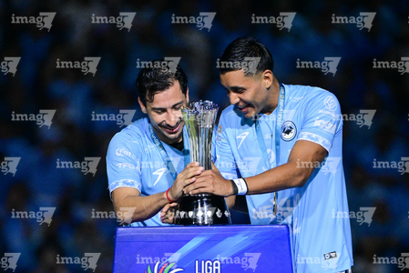 Tampico Madero, Tamaulipas, 6 de diciembre de 2025. Sergio Flores y Gerardo Ruíz en festejo con el trofeo de campeón, durante el partido correspondiente a la vuelta de la Gran Final del torneo Apertura 2025 de la Liga BBVA Expansión MX, entre la Jaiba Brava del Tampico Madero y los Freseros de irapuato, realizado en el estadio Tamaulipas. Foto: Imago7/ Richard Vogel