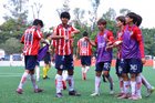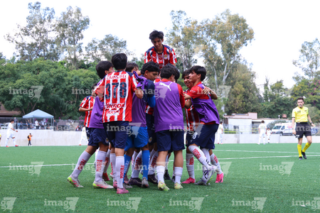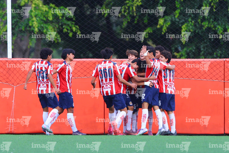 Zapopan, Jalisco, 20 de noviembre de 2025. Jugadores de Chivas en festejo de gol, durante el partido correspondiente a la ida de las Semifinales del torneo Apertura 2025 de la Liga BBVA MX categoría Sub15, entre las Chivas Rayadas del Guadalajara y los Diablos Rojos del Toluca, realizado en Verde Valle. Foto: Imago7/ Juan Carlos Cubeyro.
