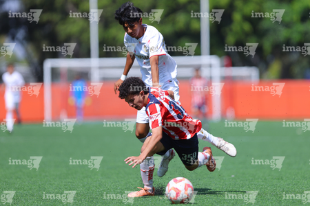Zapopan, Jalisco, 20 de noviembre de 2025. Santiago Díaz y Marcelo Villarreal, durante el partido correspondiente a la ida de las Semifinales del torneo Apertura 2025 de la Liga BBVA MX categoría Sub15, entre las Chivas Rayadas del Guadalajara y los Diablos Rojos del Toluca, realizado en Verde Valle. Foto: Imago7/ Juan Carlos Cubeyro.