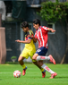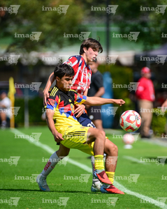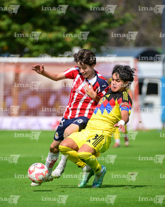 Ciudad de México, 29 de noviembre de 2025. Illich Blanco y Dilan Padilla, durante el partido correspondiente a la vuelta de la Final del torneo Apertura 2025 de la Liga BBVA MX categoría Sub 15, entre las Águilas del América y las Chivas Rayadas del Guadalajara, realizado en Copa. Foto: Imago7/ Mauricio Ruiz