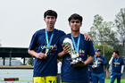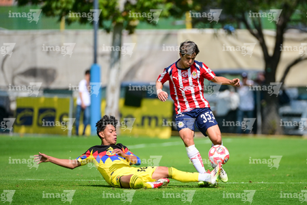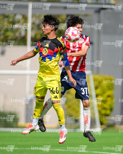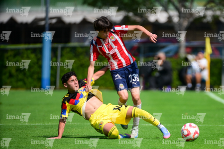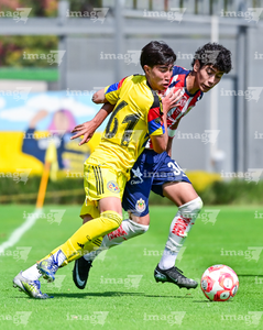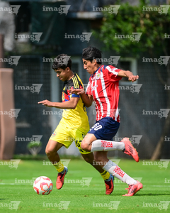 Ciudad de México, 29 de noviembre de 2025. Uriel Torres y Marcelo Villareal, durante el partido correspondiente a la vuelta de la Final del torneo Apertura 2025 de la Liga BBVA MX categoría Sub 15, entre las Águilas del América y las Chivas Rayadas del Guadalajara, realizado en Copa. Foto: Imago7/ Mauricio Ruiz