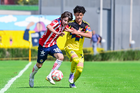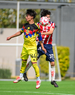 Ciudad de México, 29 de noviembre de 2025. Dilan Padilla y Luis Valdez, durante el partido correspondiente a la vuelta de la Final del torneo Apertura 2025 de la Liga BBVA MX categoría Sub 15, entre las Águilas del América y las Chivas Rayadas del Guadalajara, realizado en Copa. Foto: Imago7/ Mauricio Ruiz