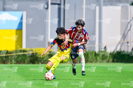 Ciudad de México, 29 de noviembre de 2025. Jesus Montenegro y Santiago Becerra, durante el partido correspondiente a la vuelta de la Gran Final del torneo Apertura 2025 de la Liga BBVA MX categoría Sub15, entre las Águiilas del América y las Chivas Rayadas del Guadalajara, realizado en Coapa. Foto: Imago7/ Alexis Chavez