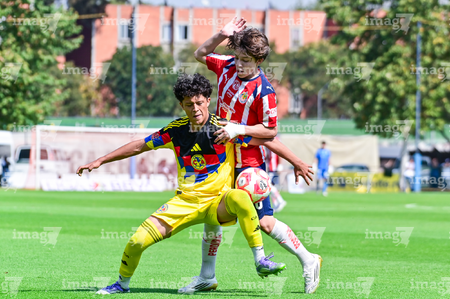 Ciudad de México, 29 de noviembre de 2025. Jesus Montenegro y René Godínez, durante el partido correspondiente a la vuelta de la Final del torneo Apertura 2025 de la Liga BBVA MX categoría Sub 15, entre las Águilas del América y las Chivas Rayadas del Guadalajara, realizado en Copa. Foto: Imago7/ Mauricio Ruiz