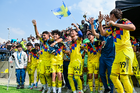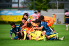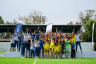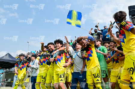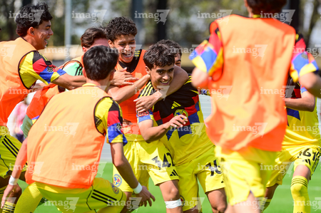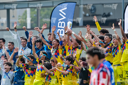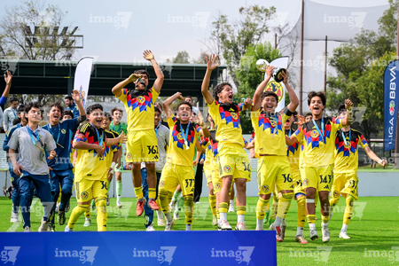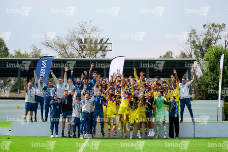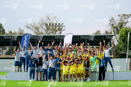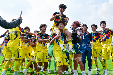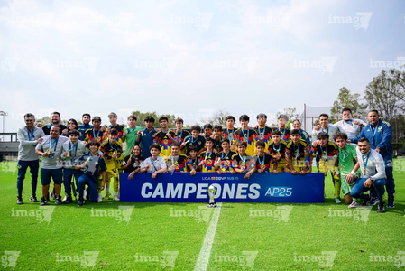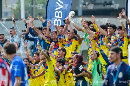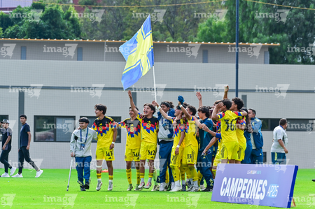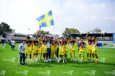 Ciudad de México, 29 de noviembre de 2025. Jugadores del América Sub15 en festejo, durante el partido correspondiente a la vuelta de la Final del torneo Apertura 2025 de la Liga BBVA MX categoría Sub 15, entre las Águilas del América y las Chivas Rayadas del Guadalajara, realizado en Copa. Foto: Imago7/ Mauricio Ruiz