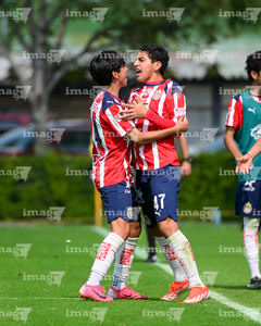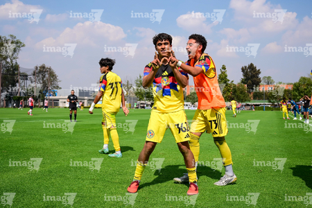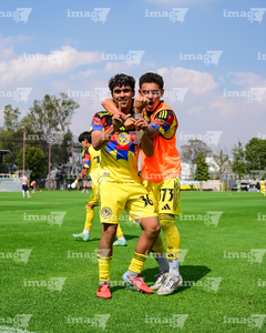 Ciudad de México, 29 de noviembre de 2025. Ángel Coronado y Noé Salazar en festejo de gol, durante el partido correspondiente a la vuelta de la Final del torneo Apertura 2025 de la Liga BBVA MX categoría Sub 15, entre las Águilas del América y las Chivas Rayadas del Guadalajara, realizado en Copa. Foto: Imago7/ Mauricio Ruiz
