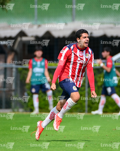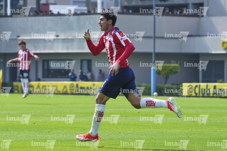 Ciudad de México, 29 de noviembre de 2025. Marcos Corral en festejo de gol, durante el partido correspondiente a la vuelta de la Gran Final del torneo Apertura 2025 de la Liga BBVA MX categoría Sub15, entre las Águiilas del América y las Chivas Rayadas del Guadalajara, realizado en Coapa. Foto: Imago7/ Alexis Chavez