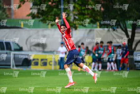 Ciudad de México, 29 de noviembre de 2025. Gustavo Figueroa en festejo, durante el partido correspondiente a la vuelta de la Final del torneo Apertura 2025 de la Liga BBVA MX categoría Sub 15, entre las Águilas del América y las Chivas Rayadas del Guadalajara, realizado en Copa. Foto: Imago7/ Mauricio Ruiz