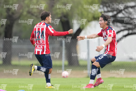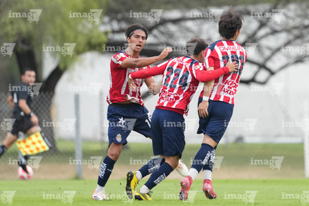 Monterrey, Nuevo León, 22 de noviembre de 2025. Jugadores de Chivas sub21 en festejo de gol, durante el partido correspondiente a los cuartos de final de vuelta del torneo Apertura 2025 de la Liga BBVA MX categoría Sub21, entre los Tigres de la UANL y las Chivas Rayadas del Guadalajara, celebrado en Zuazua. Foto: Imago7/