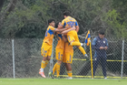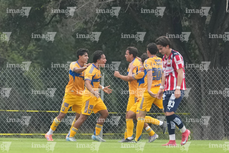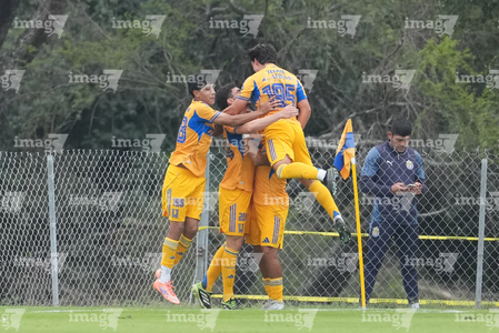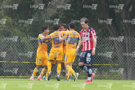 Monterrey, Nuevo León, 22 de noviembre de 2025. Jugadores de Tigres en festejo de gol, durante el partido correspondiente a los cuartos de final de vuelta del torneo Apertura 2025 de la Liga BBVA MX categoría Sub21, entre los Tigres de la UANL y las Chivas Rayadas del Guadalajara, celebrado en Zuazua. Foto: Imago7/
