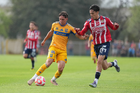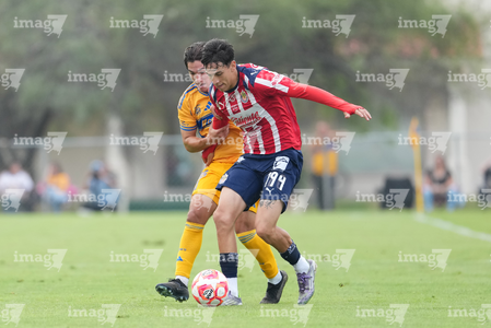 Monterrey, Nuevo León, 22 de noviembre de 2025. Kenneth Jaime y Leonardo Torres, durante el partido correspondiente a los cuartos de final de vuelta del torneo Apertura 2025 de la Liga BBVA MX categoría Sub21, entre los Tigres de la UANL y las Chivas Rayadas del Guadalajara, celebrado en Zuazua. Foto: Imago7/