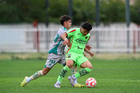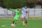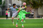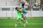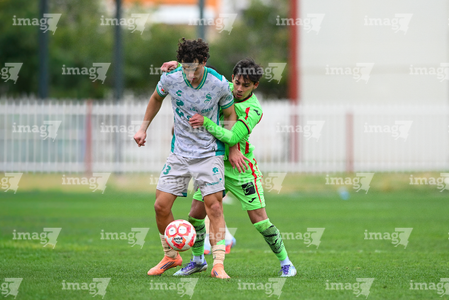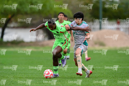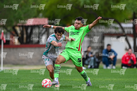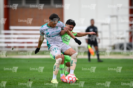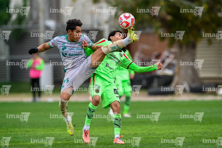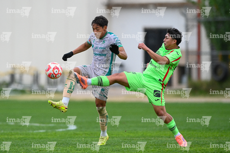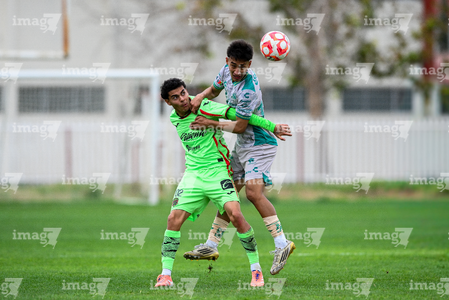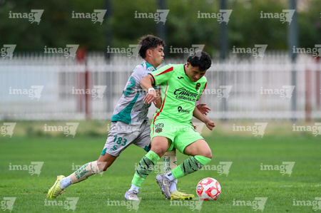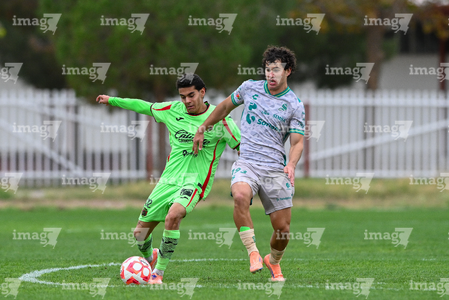 Ciudad Juárez, Chihuahua, 19 de noviembre de 2025. Fred Leventis y André Martínez, durante el partido correspondiente a la ida de los cuartos de final del torneo Apertura 2025 de la Liga BBVA MX categoría Sub21, entre los Bravos de FC Juárez y los Guerreros del Santos Laguna, realizado en realizado en el Instituto Tecnológico de Ciudad Juárez. Foto: Imago7/ José Zamora