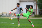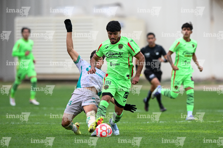 Ciudad Juárez, Chihuahua, 19 de noviembre de 2025. Nelson Cedillo e Israel Larios, durante el partido correspondiente a la ida de los cuartos de final del torneo Apertura 2025 de la Liga BBVA MX categoría Sub21, entre los Bravos de FC Juárez y los Guerreros del Santos Laguna, realizado en realizado en el Instituto Tecnológico de Ciudad Juárez. Foto: Imago7/ José Zamora