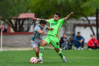 Ciudad Juárez, Chihuahua, 19 de noviembre de 2025. Nelson Cedillo y Mario Cota, durante el partido correspondiente a la ida de los cuartos de final del torneo Apertura 2025 de la Liga BBVA MX categoría Sub21, entre los Bravos de FC Juárez y los Guerreros del Santos Laguna, realizado en realizado en el Instituto Tecnológico de Ciudad Juárez. Foto: Imago7/ José Zamora