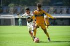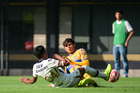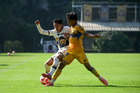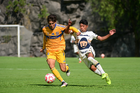 Ciudad de México, 26 de noviembre de 2025. Samuel Pérez y Manuel Sánchez, durante el partido correspondiente a la semifinal de ida del torneo Apertura 2025 de la Liga BBVA MX categoría Sub21, entre los Pumas de la UNAM y los Tigres de la UANL, realizado en Cantera. Foto: Imago7/Alexis Chavez