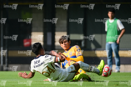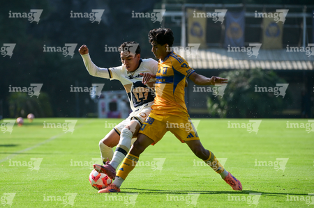 Ciudad de México, 26 de noviembre de 2025. Gerardo Serralde y Isac Galván, durante el partido correspondiente a la semifinal de ida del torneo Apertura 2025 de la Liga BBVA MX categoría Sub21, entre los Pumas de la UNAM y los Tigres de la UANL, realizado en Cantera. Foto: Imago7/Alexis Chavez