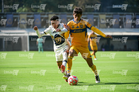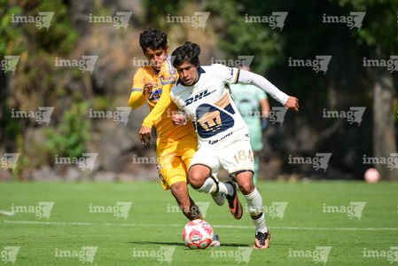 Ciudad de México, 26 de noviembre de 2025. Jorge Leyva y José González, durante el partido correspondiente a la semifinal de ida del torneo Apertura 2025 de la Liga BBVA MX categoría Sub21, entre los Pumas de la UNAM y los Tigres de la UANL, realizado en Cantera. Foto: Imago7/Alexis Chavez