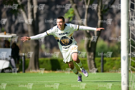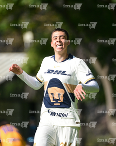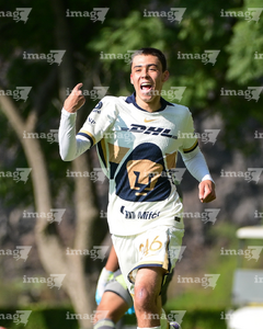 Ciudad de México, 26 de noviembre de 2025. Bernardo Parra en festejo de gol, durante el partido correspondiente a la semifinal de ida del torneo Apertura 2025 de la Liga BBVA MX categoría Sub21, entre los Pumas de la UNAM y los Tigres de la UANL, realizado en Cantera. Foto: Imago7/Alexis Chavez
