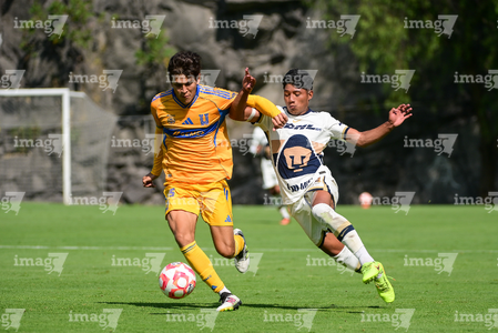 Ciudad de México, 26 de noviembre de 2025. Bernardo Parra y Gerardo Serralde, durante el partido correspondiente a la semifinal de ida del torneo Apertura 2025 de la Liga BBVA MX categoría Sub21, entre los Pumas de la UNAM y los Tigres de la UANL, realizado en Cantera. Foto: Imago7/Alexis Chavez