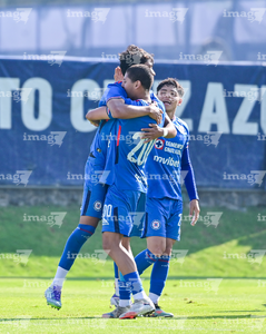 Ciudad de México, 26 de noviembre de 2025. Jugadores del Cruz Azul en festejo de gol, durante el partido correspondiente a la ida de la Semifinal del torneo Apertura 2025 de la Liga BBVA MX categoría Sub 21, entre la Máquina Celeste de la Cruz Azul y los Guerreros del Santos Laguna, realizado en La Noria. Foto: Imago7/ Mauricio Ruiz