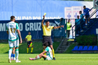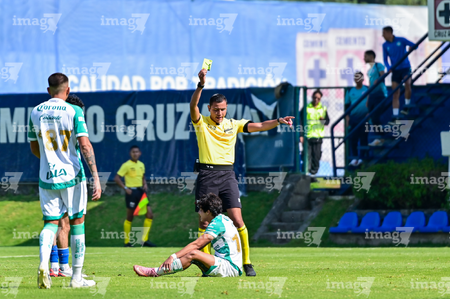 Ciudad de México, 26 de noviembre de 2025. Alejandro Tavernier Pérez, árbitro central, muestra tarjeta amarilla de amonestación, durante el partido correspondiente a la ida de la Semifinal del torneo Apertura 2025 de la Liga BBVA MX categoría Sub 21, entre la Máquina Celeste de la Cruz Azul y los Guerreros del Santos Laguna, realizado en La Noria. Foto: Imago7/ Mauricio Ruiz