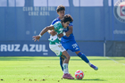 Ciudad de México, 26 de noviembre de 2025. Josué Díaz y Arneth González, durante el partido correspondiente a la ida de la Semifinal del torneo Apertura 2025 de la Liga BBVA MX categoría Sub 21, entre la Máquina Celeste de la Cruz Azul y los Guerreros del Santos Laguna, realizado en La Noria. Foto: Imago7/ Mauricio Ruiz