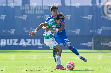 Ciudad de México, 26 de noviembre de 2025. Bryan Casas y Thiago Martínez, durante el partido correspondiente a la ida de la Semifinal del torneo Apertura 2025 de la Liga BBVA MX categoría Sub 21, entre la Máquina Celeste de la Cruz Azul y los Guerreros del Santos Laguna, realizado en La Noria. Foto: Imago7/ Mauricio Ruiz