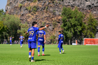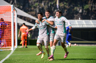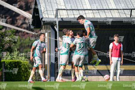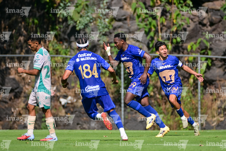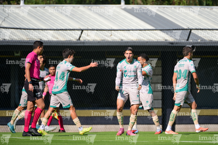Ciudad de México, 03 de diciembre de 2025. Jugadores de Santos Sub 21 en festejo de gol, durante el partido correspondiente a la final de ida del torneo Apertura 2025 de la Liga BBVA MX categoría Sub21, entre los Pumas de la UNAM y los Guerreros del Santos Laguna, realizado en Cantera. Foto: Imago7/ Mauricio Ruiz