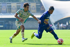 Ciudad de México, 03 de diciembre de 2025. Yonathan Del Valle y Thiago Martínez, durante el partido correspondiente a la final de ida del torneo Apertura 2025 de la Liga BBVA MX categoría Sub21, entre los Pumas de la UNAM y los Guerreros del Santos Laguna, realizado en Cantera. Foto: Imago7/ Alexis Chavez