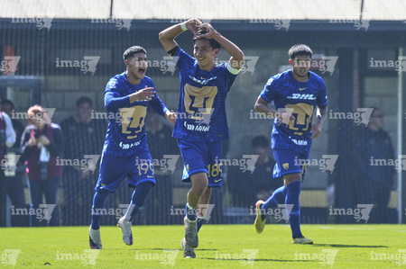 Ciudad de México, 03 de diciembre de 2025. Jugadores de Pumas Sub 21 en festejo de gol, durante el partido correspondiente a la final de ida del torneo Apertura 2025 de la Liga BBVA MX categoría Sub21, entre los Pumas de la UNAM y los Guerreros del Santos Laguna, realizado en Cantera. Foto: Imago7/ Mauricio Ruiz