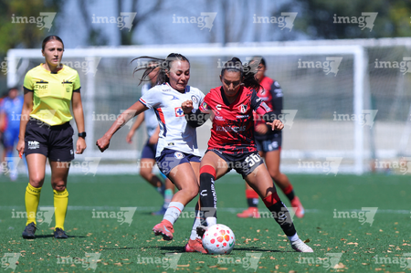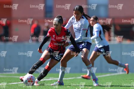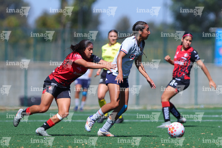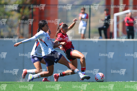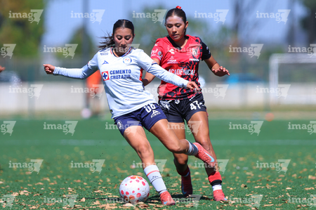Guadalajara, Jalisco, 12 de noviembre de 2025. Ema Esquivel y Mitzy Amezcua, durante el partido correspondiente a los Cuartos de Final del torneo Apertura 2025 de la Liga BBVA MX Femenil categoría Sub19, entre las Rojinegras del Atlas y la Máquina Celeste del Cruz Azul, realizado en la Academia AGA. Foto: Imago7/ Juan Carlos Cubeyro.