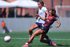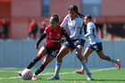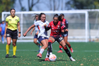 Guadalajara, Jalisco, 12 de noviembre de 2025. Estephanie Gutierrez y Elisheba Velázquez, durante el partido correspondiente a los Cuartos de Final del torneo Apertura 2025 de la Liga BBVA MX Femenil categoría Sub19, entre las Rojinegras del Atlas y la Máquina Celeste del Cruz Azul, realizado en la Academia AGA. Foto: Imago7/ Juan Carlos Cubeyro.